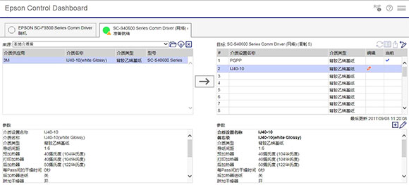 Epson Control Dashboard软件重磅来袭!可以很好的解决大家的难题。用户通过Epson Control Dashboard软件,从服务器上下载EMX文件,该文件预置包括ICC曲线、硬件介质参数。预设文件的好处就是极大简化用户的操作流程。要知道在打印机硬件操作上,针对不同的介质,要进行多种参数的优化设置,主要包括打印头间距、打印前中后三阶段的加热器温度、介质张力、搓纸轮压力、平台吸力、后纸纠偏以及定期清洗时间等,设置虽然不难,但毕竟需要一点点的时间和经验。而大家用的打印机型号和介质不同,在各种交流平台上也很难找到匹配的参考数值,这种感觉就像买了没料包的泡面一样不知所措。而现在Epson Control Dashboard软件的出现,用户可以轻松地针对某一介质,在软件上找到专门制定的预置参数,仅需轻松一点,介质参数全部会自动导入,高精度与高品质打印模式随心选择,一个优质的打印设置就这么完成了!